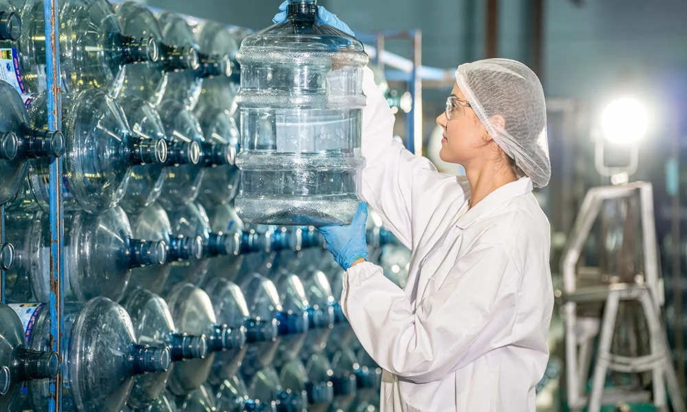 kaynak suyu etiketi okuma için üretimde boş damacanayı ışığa karşı inceleme
